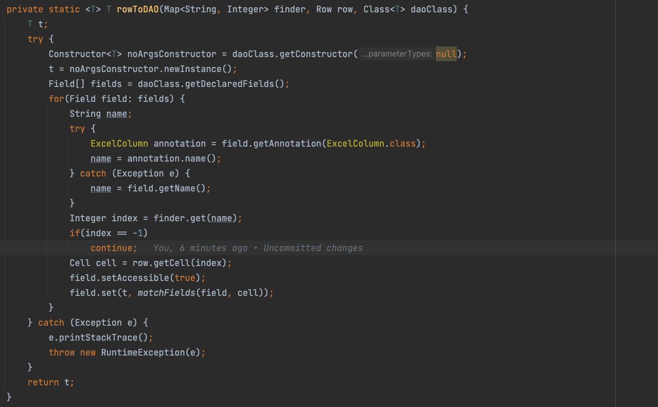 rowToDAO 메서드를 사용하여 해당 row 에 맞는 ExcelDAO 객체를 반환하게 됩니다.