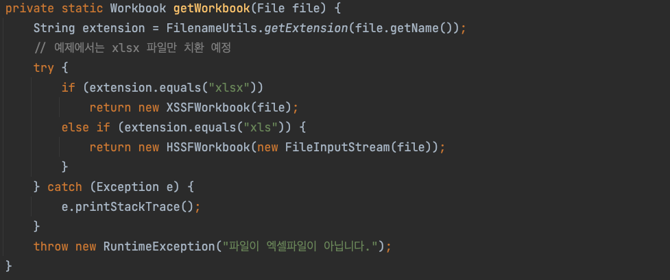 아파치 poi 는 xls 형식의 경우 HSSFWorkbook 을 , xlsx 형식의 경우 XSSFWorkbook 생성자를 사용해야 합니다. 이 두개의 상위 타입인 Workbook을 반환하겠습니다.